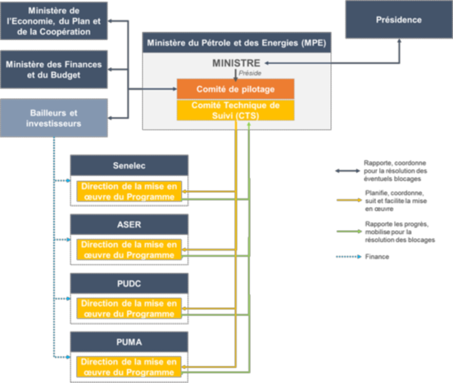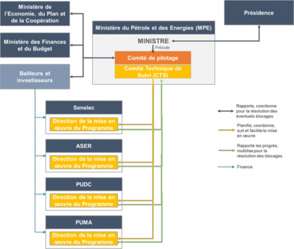 - Le Comité de Pilotage, présidé par le Ministre en charge de l’Energie, en charge de la coordination avec les parties prenantes externes et de la résolution des blocages de haut niveau rencontrés dans la mise en œuvre du programme. Y siègent des représentants du Ministère de l’Economie, du Plan et de la Coopération, du Ministère des Finances et du Budget, des bailleurs et grands investisseurs impliqués, ainsi que des agences d’exécution.
